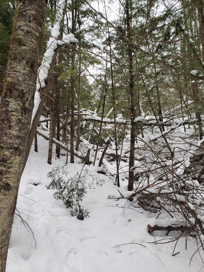 About a mile up the trail we came to the sign for the backpack camping site. Mike originally thought it was going to be on a bluff above the river (based on looking at the map), but it quickly became apparent that it was right down on the river. Tammy being the trooper that she is said this was fine and that we could make our way down. Earlier in the week she tweaked her knee after slipping and falling on an icy driveway on our daily Henry walk- but she was doing much better today. Now this trail to the backpack campsite was even LESS traveled than the North Country Trail. It looked like only one set of tracks and maybe some cross country skis had gone down sometime since the first snow had fallen, but certainly not recently. Mike had his All Trails app going and looking at where we were on the map vs where the trail was supposed to be — well, we were kind of staying on the trail. For the first couple tenths of a mile, it was pretty easy to follow the trail — it was a nice wide area along the creek. However, very soon that nice, obvious, trail turned down to the creek and this is what we saw: