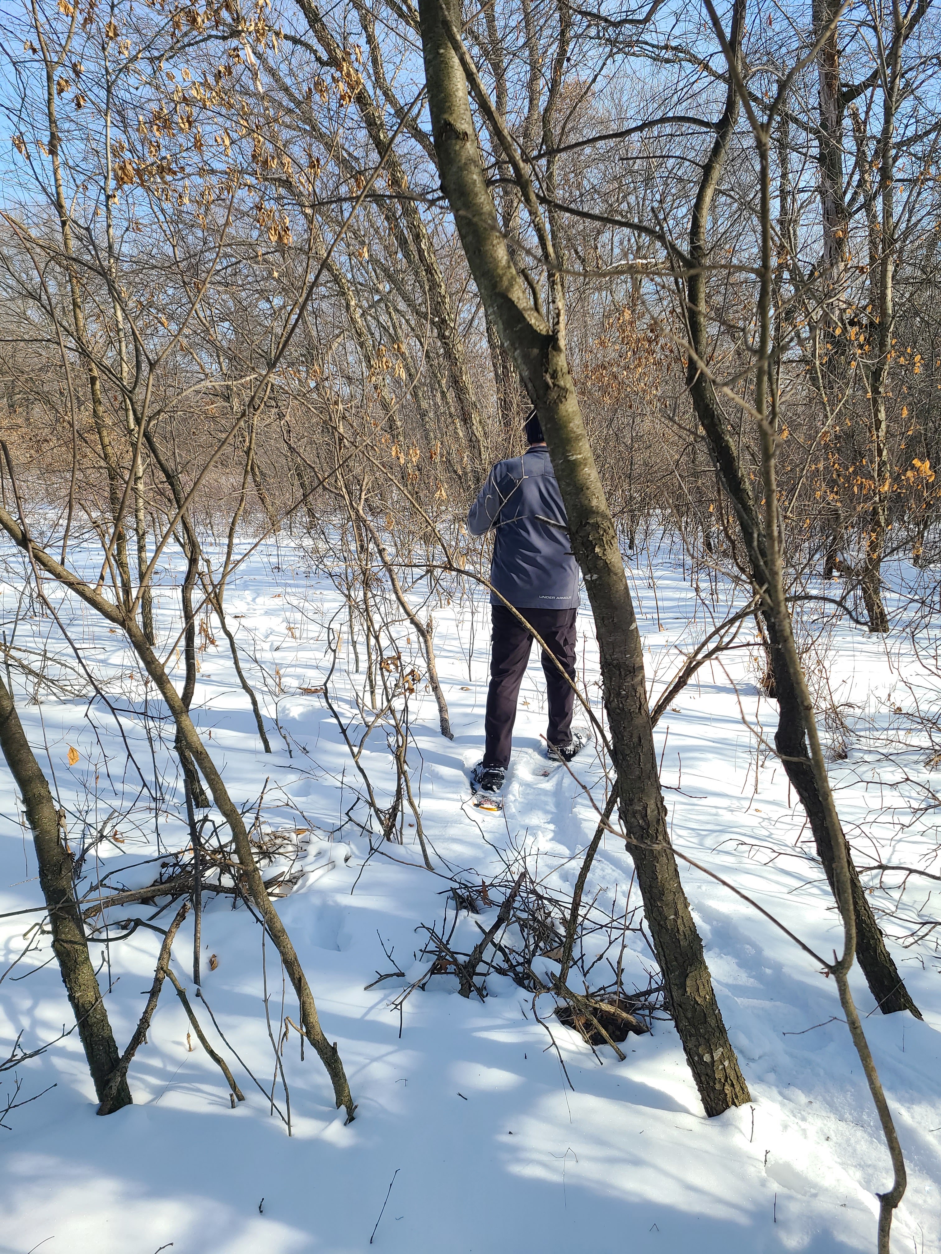We made it back to the van just in time for someone else to pull up behind us and get their snowshoes out too — what can we say, we’re trendsetters. The next loop was going to be complete bushwhacking (snow-whacking?) where Mike wanted to head down to the river and back. Mike attempted to assure Tam that we would NOT be going through super thick brush like our last snowshoe adventure to the Chippewa River. As we got closer to the river thought the brush got thicker and thicker.