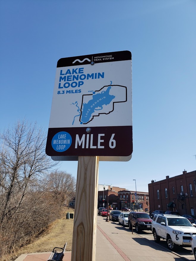 Luckily we had already talked about the Lake Menomin Loop trail that goes around (oddly enough) Lake Menomin in Menomonie, WI. So after getting everything squared away with the van, we were ready to ‘Splore. This was an 8.3 mile loop. We decided to start with Happy Hour since we were already starting our splorin’ day a little late and stopped by Waterfront Bar and Grill where we had amazingly good bloodies and some appetizers (spicy naked wings and spicy cheese curds). We were then off to conquer the trail.