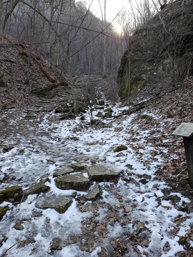 After drinking in the beauty of the river, we had work to do — we had to climb back up out of the river valley. While the steps coming down to the river on the one side were real steps, the ones on the other side were stone steps placed by the CCC many, many years ago. As such there has been a lot of settling and deterioration so some of those steps are very big and there are stretches of trail in between the steps that are quite steep. We made it to the top in no time however, our crampons doing a lot of the work for us. We then made it to where the North Country Trail veers off of the main Doughboys Trail.