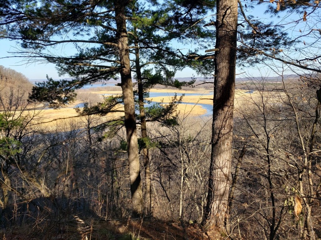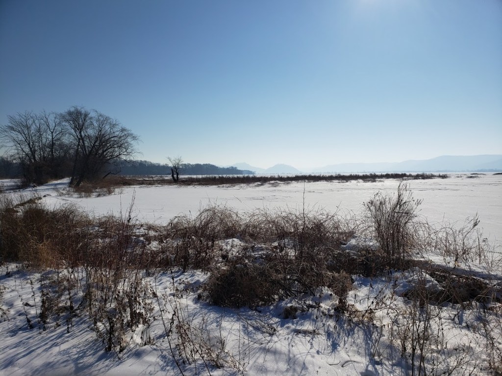 We left the restaurant and the van was saying the temp had risen to -10F — woo hoo!! We had a half hour drive to get to the Trempealeau Wildlife Refuge hoping the sun would do it’s job and keep that temp going up. We had been to the refuge in the early fall of 2020 and were excited to see it in snow. The plan for the day was to hike the loop drive (about 5-6 miles) in the morning and then possibly do some snowshoeing in the afternoon. If time was available we were going to head to nearby Perrot State Park and do some freestyle Splorin’ (same thing as regular Splorin’ but Mike doesn’t make a plan for it). Arriving at the refuge with the temp right at 0F — we decided the only way to stay warm, as often is the case in winter in Wisconsin, was to get moving! We struck out on the loop road and quickly noted all the places on our bodies we were not quite ready for this temp (primarily our noses, fingers and toes). But the sheer beauty of nature in Wisconsin distracted us from our cold bones quite quickly.