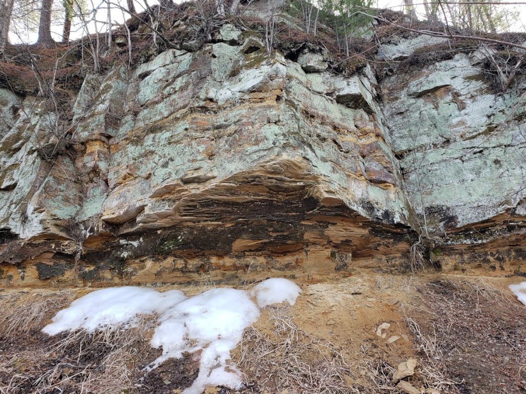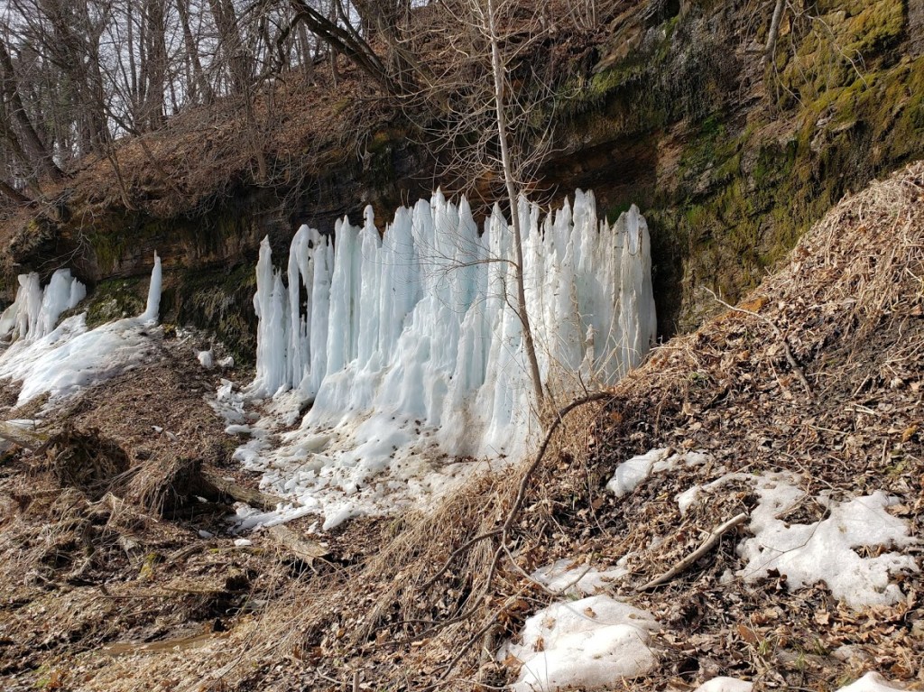 Up around a bend in the trail we could see more snow/ice. We were worried this would be yet another dangerous section of slipping and sliding. But as we approached we saw that it was melting ice from the bluffs. In this area of Wisconsin we see a lot of this in the winter where water moves through the limestone and when exits in winter it makes beautiful ice formations. These were the remnants of those. The pictures in no way do justice to the formations now as they are melting from the back to the front. So, these were actually like ice “walls” that had space between the bluff and the ice. There were large chunks that had fallen out onto the trail, so you really did not want to linger too long and look.