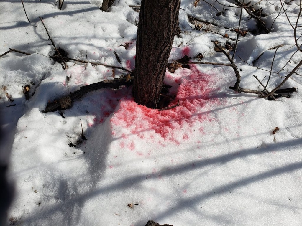 The second thing was Mike spotted a red color around the base of a tree off the side of the trail. At first Mike thought it must be some kind of algae or something growing on the surface of the snow. But pretty soon we started seeing more and more of it and it became apparent it was something was sprayed at the base of trees and bushes along the trail. We then noticed a “oily scent” in the air. Mike tried to smell the “red snow”. Much to Tam’s chagrin he did so while removing his gloves — thankfully his fingers didn’t melt from whatever the chemicals were. A quick inquiry after we got home to the Trempealeau National Wildlife Refuge gave us the answer. It turns out it is a herbicide to try to kill the invasive Black Locust trees that have shown up in the refuge. They add the red coloring so they can ensure direct application to the base of the tree/bushes.