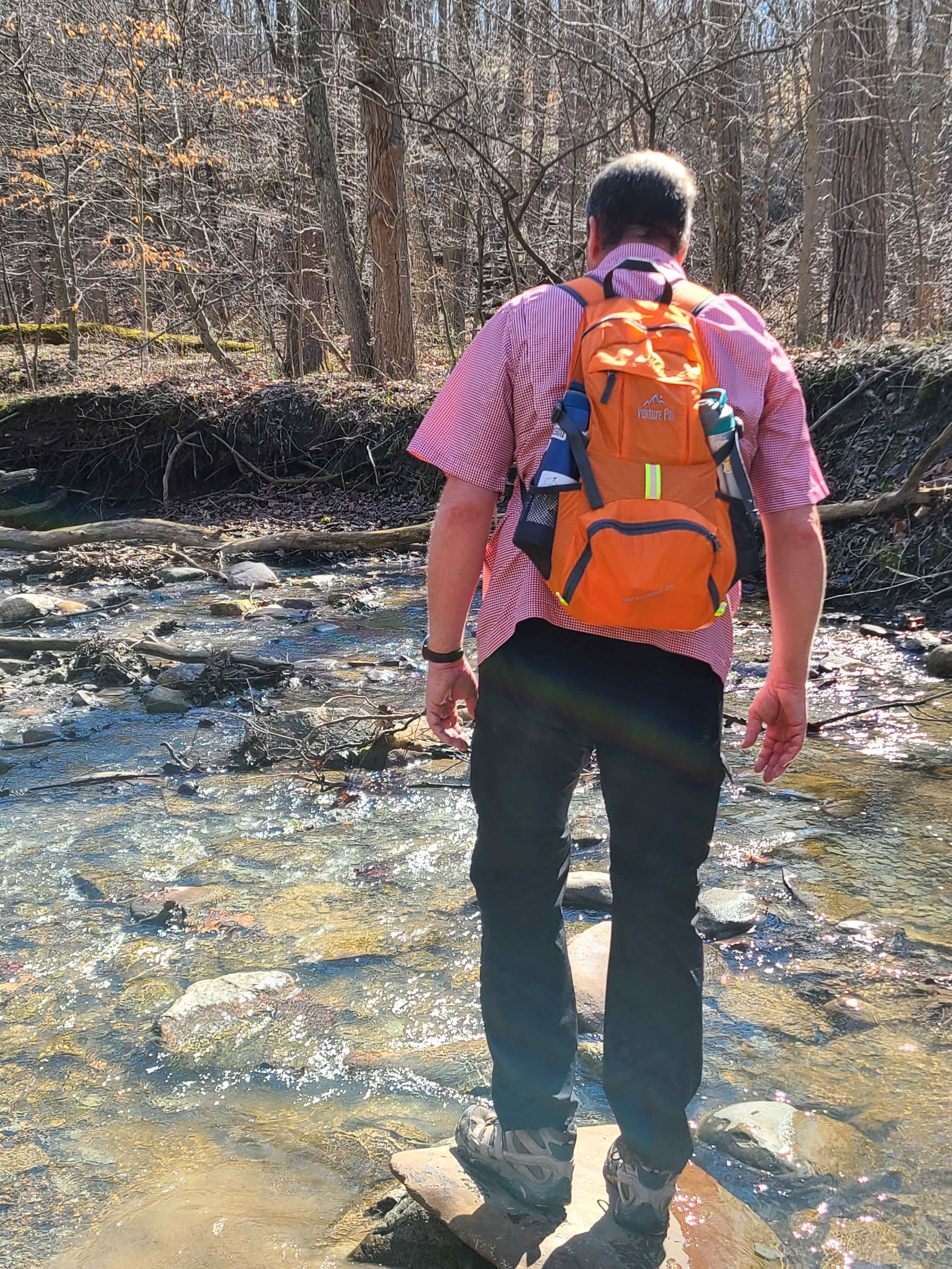 We had enough time to do an out-and-back hike on the lower portion of this segment and it was a mighty beautiful walk in the woods. It started off on some narrow “board walk” and crossed a little stream. We had fun trying to dodge the mud in the middle of the trail — luckily there were lots of logs, roots and rocks to aid us in staying fairly dry and mud free.