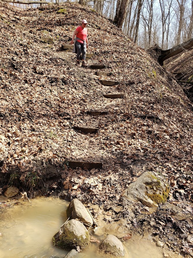Most of this trail was pretty “moderate” with ups and downs but nothing too difficult. There was one point on the trail ahead that was labeled as “difficult”. Mike knew it was short, but looking at the maps he was unable to tell what would make it difficult. When we stood at the top of the very large hill that led down to a little stream and then what looked like back up and equally steep hill, we knew what the “difficult” section was. But, Tammy has a noticed something over all of our hikes. The hills that we look at like this that appear to be huge, usually end up not being so bad. (Or at least that is what she tells herself to keep going!) So we started down the hill, and that was bad because of Tammy’s knee, but we were up the other side in about 4 or 5 minutes — not bad at all.