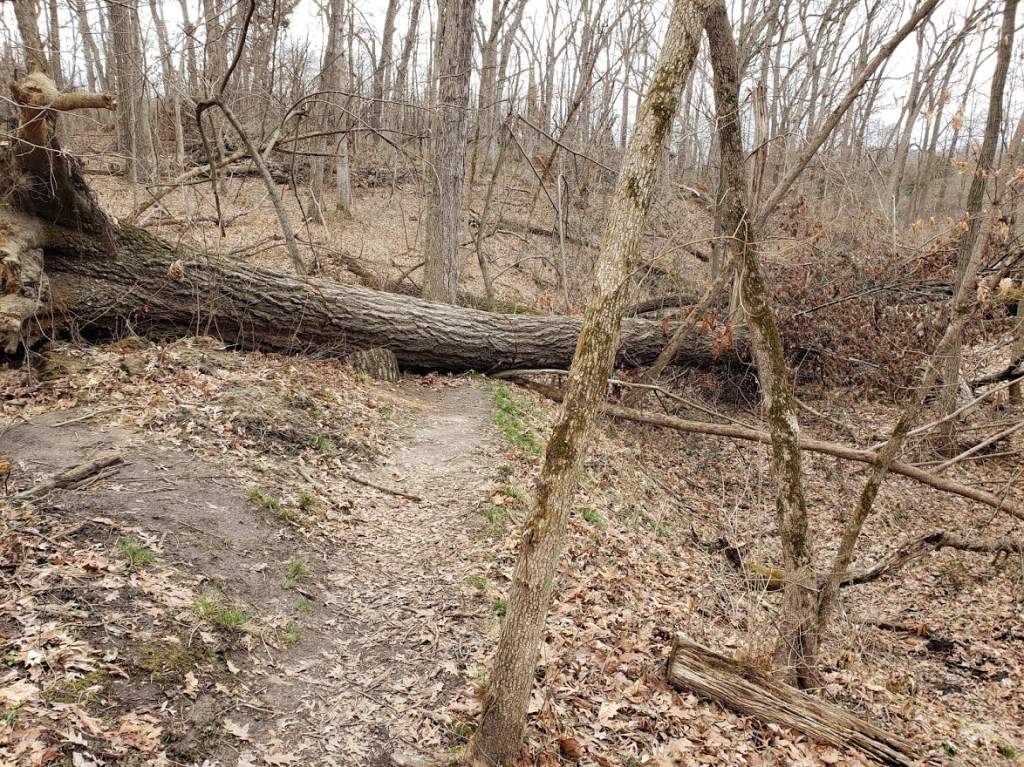 The reason we could not go to this park before was the storm that came through in August of 2020. Lots of tornadoes and just straight line winds reaching over 100 mph. The cleanup obviously took a long time and is still ongoing. While it is amazing to see all the trees down, it is equally amazing to see all the trees still standing. So many lost their battle with their roots while many others survived. Heading down towards the river we walked across a ridge high above the water, still just in awe of all the trees down. With no leaves on the trees you could see deep into the forest to see them all lying there.