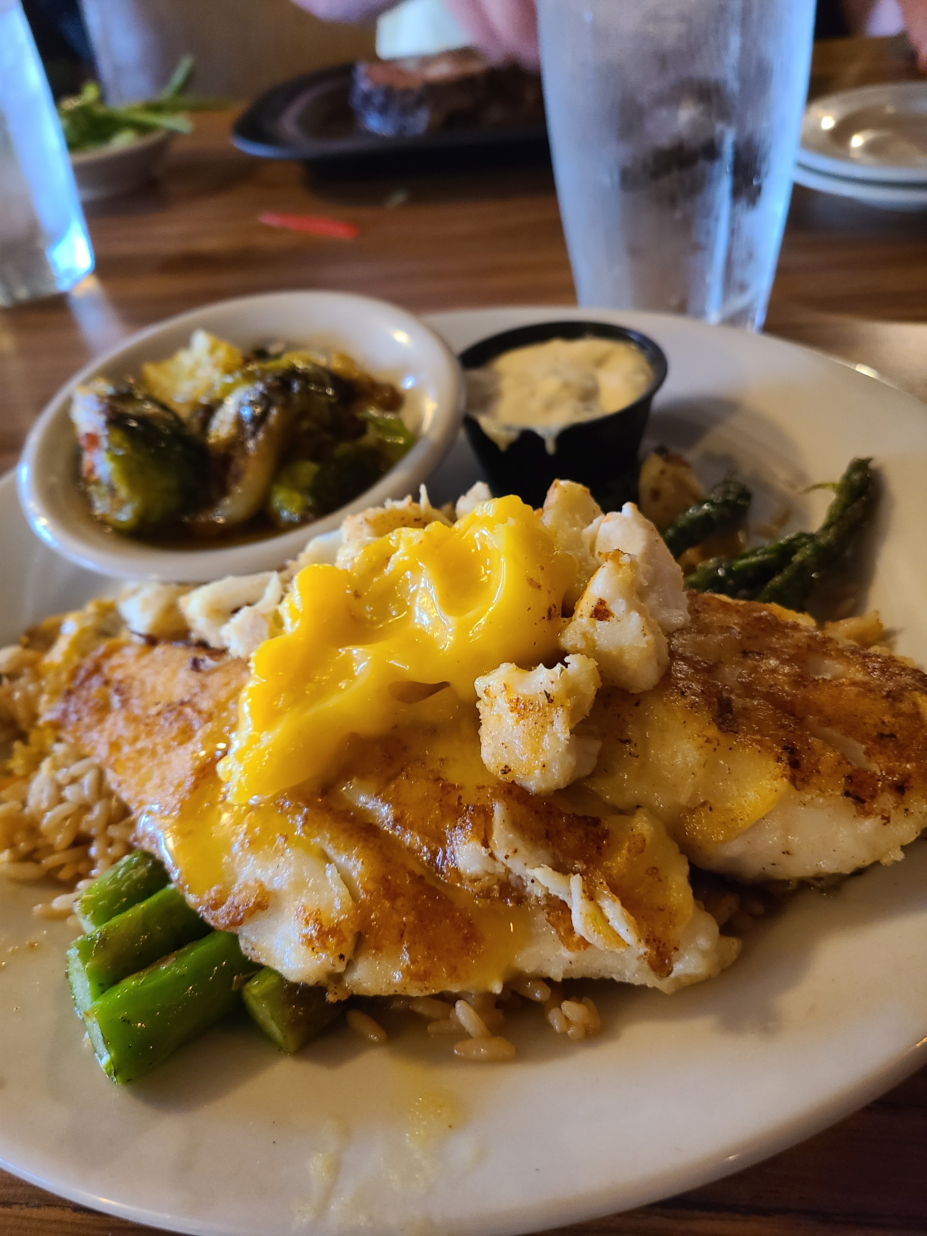 So, back to this particular supper club — when we walked in we knew it was a winner. A great big horseshoe shaped bar and dark wood walls and we were shown to our very private booth. We sat right next to a huge salad bar that a couple of years ago would have been very busy, but this year was out of service. For cocktails Mike stuck with his tried and true whiskey diet coke and Tammy went on an adventure with a French 75 (gin, champagne, lemon juice and sugar (minus the sugar)). She loved it!! Mike got his usual Prime Rib and Tammy got a chicken something or maybe steak and shrimp….idk, but she will correct this upon editing. (Tammy’s memory is NOT as good as Mike’s, however, she DID take a picture this time and apparently she had an “oscar style” fish with brussel sprouts.)