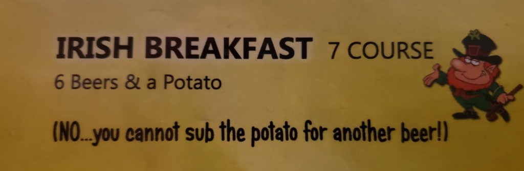 When we arrived there was a table of four and several tables of one — it was like a “dispersed coffee klatch”. We joked that maybe this was the “older generation singles club” where you came to meet others. Throughout our breakfast several other singles came in — they all seemed to know one another, but apparently not well enough (or may too-well enough) that they didn’t sit together. The menu was your typical small town diner fare with some interesting names like “Road Kill”, “The Terminator” and “The Big Mouth”. We stuck to our normal breakfast with Tammy opting for a side of two sausage patties instead of asking about a salad. They were not only the best breakfast sausage we have had, each was at least a quarter pound in size!!! Oh, they also had an “Irish Breakfast”: