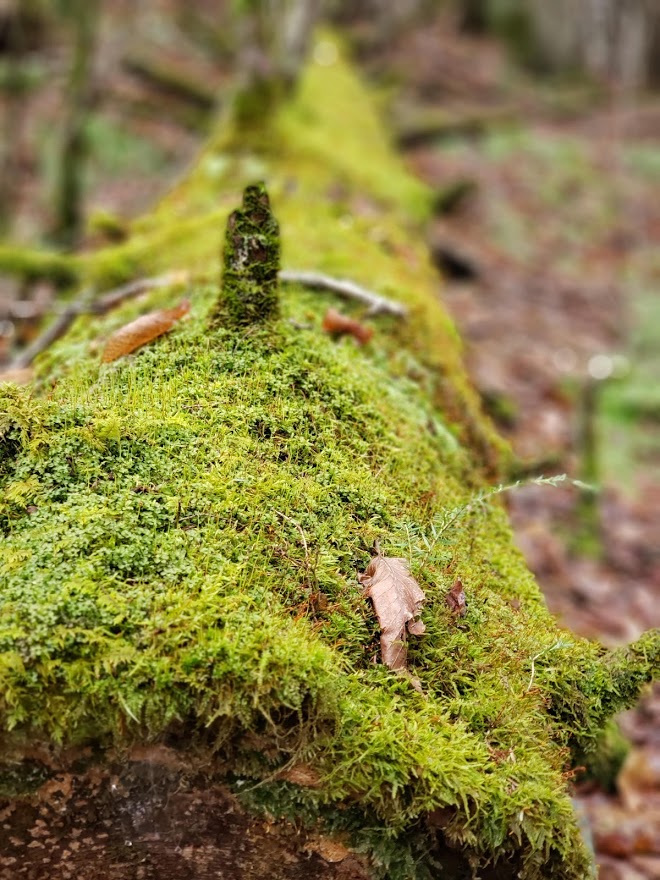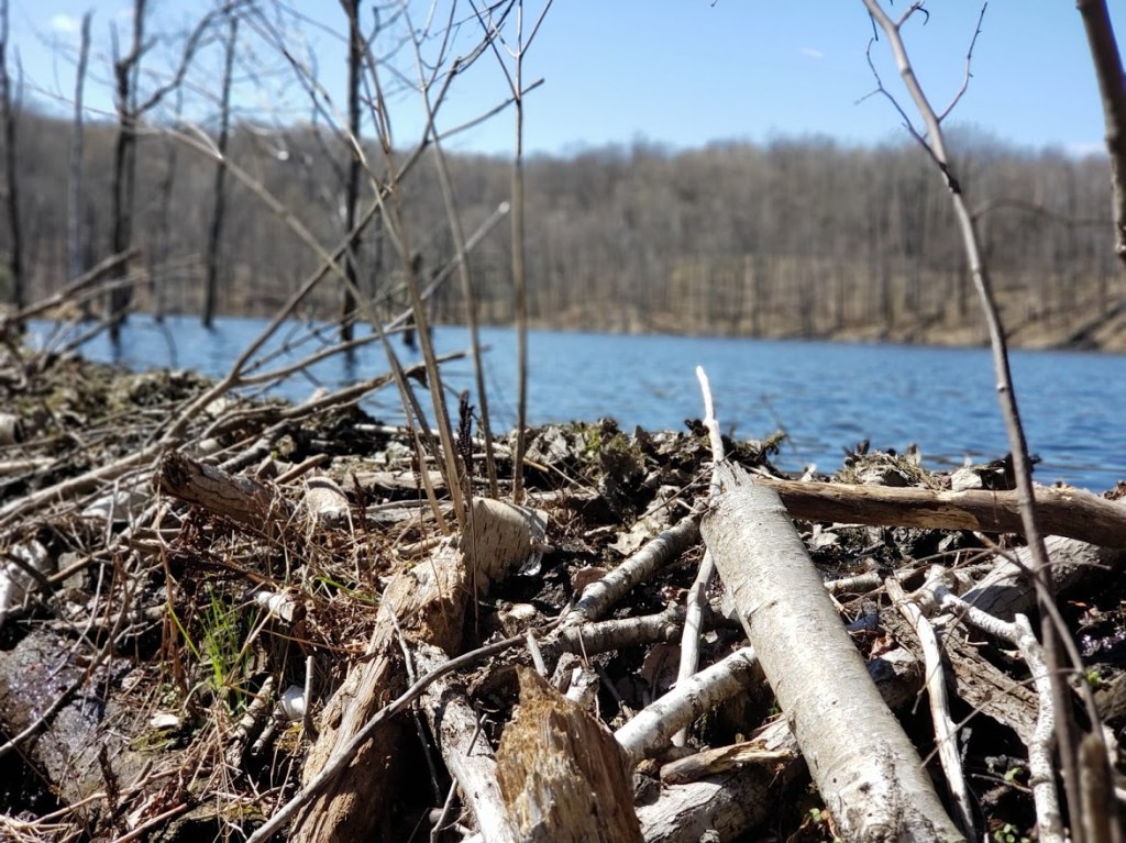 We encountered a portion of the trail where active logging was taking place, lots of piles of logs spread along the road; luckily no one was actually logging on this Saturday morning. As we came down off the ridge we could see this amazingly blue little lake that stood in stark contrast to the all the browns of the leaves on the forest floor waiting for the greenery of Spring to pop its way through. There were a couple of turtles on one of the logs, but they plopped into the water before a picture could be taken of them.