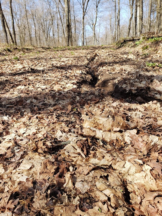 The central part of the trail is on top of a ridge so were also expecting a little bit of an uphill section — what we didn’t expect was that the trail was going to turn into a total spongy mess in parts. As we turned away from the stream and started to make our way up the hill, we noticed that there was a little more mud than we had seen earlier in the morning. Actually, the worst part was that you really could not see most of it. The trail was completely covered with leaves and those leaves covered both the good solid ground for hiking and also the very muddy, soupy ground not so good for hiking.