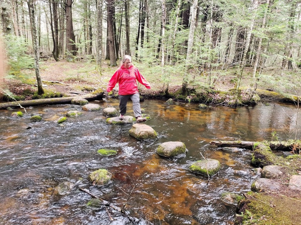 The trails here are VERY well marked — it seems as though this is primarily used for cross country skiing in the winter, but the hiking is awesome as well. What wasn’t well marked was what to do at the gate at the end of the gravel road. Of course Mike was using AllTrails, but it wasn’t immediately obvious if we were supposed to go around the gate, or go somewhere else. We went around the gate and just a little further down we found the “2km” marker (this was part of the 11km loop trail) and each kilometer was marked off. This entirety of the trail was two lane “road type” former logging roads. We thought this would make the hiking much easier, but as we were about to find out, that is not always the case. A portion of this part of the trail led along this beautiful little stream that was gorgeous in the early morning sun.