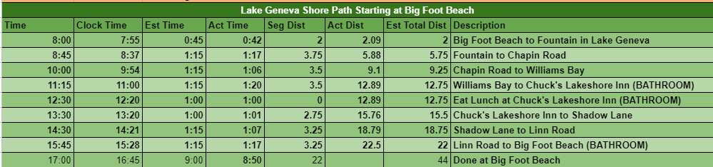 The reason the “short” typo above was allowed to stay is this not even remotely close to “short”. From Mike’s research we knew that it is 21 miles to go all the way around the lake. Mike also found some places that said that the shore path was 26 miles, but his trusty go-to app said it would be about 22 miles all the way around. Mike found a great article called Around the Lake in a Day that laid out the distances and times for each of the sections. This led Mike to lay all of this out in, of course, a spreadsheet.