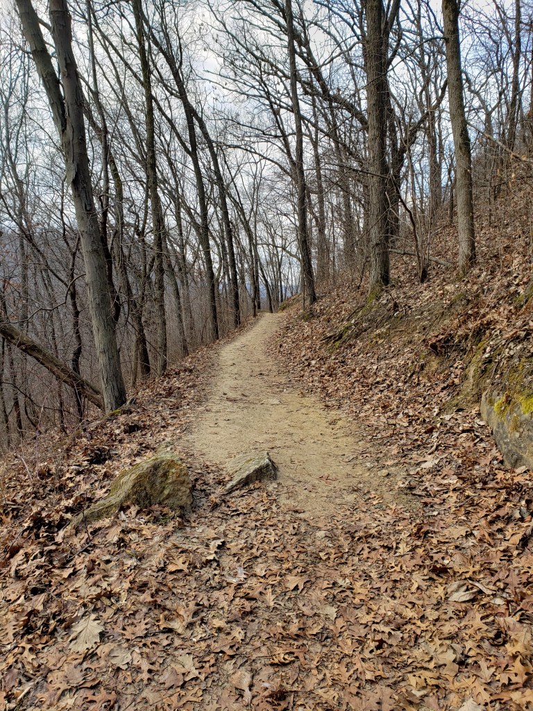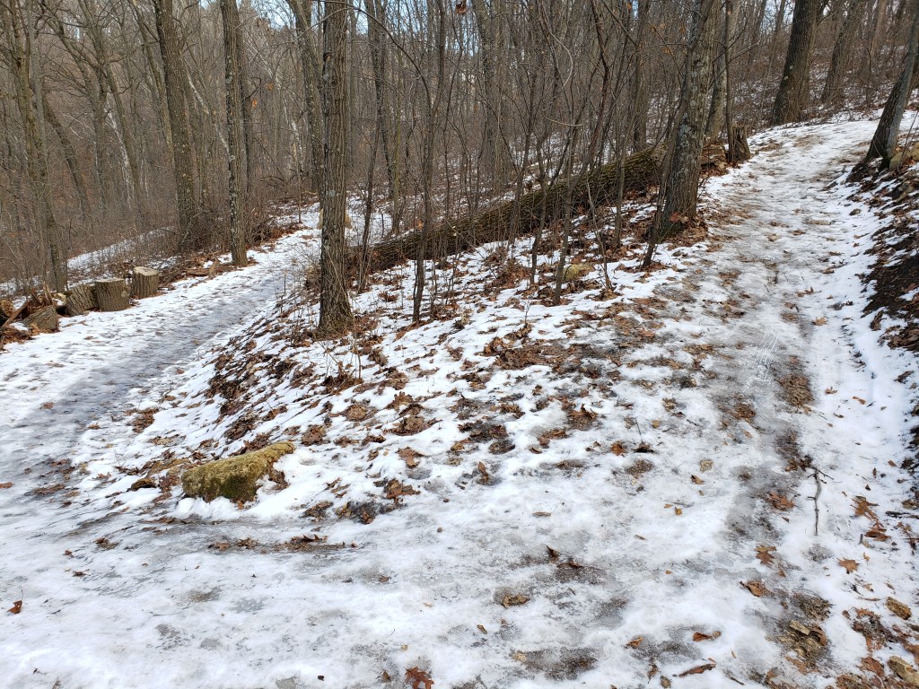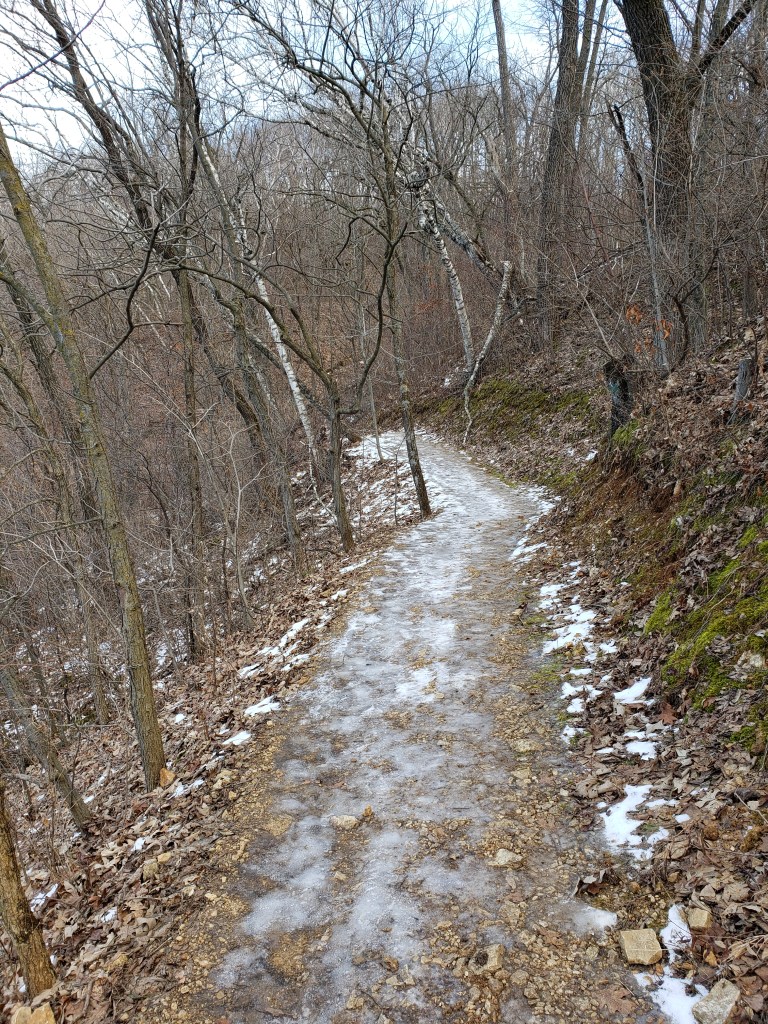 We knew there was another uphill section that was on the North side of the bluff so it was going to likely be covered in ice. We were not disappointed (or maybe we were…). Regardless it was a long hike up the switchbacks that were completely covered in ice. A couple of times we cut straight up hill rather than trying to walk up the trail because it was so covered in ice.