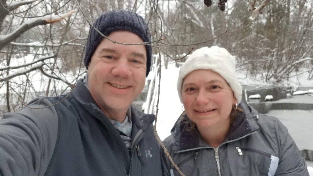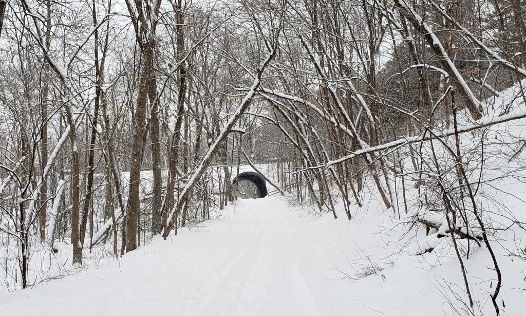 Both of us were a little apprehensive about our first foray into snowshoeing. Both of us had done it in the past, but that was a LONG time ago. On our way to the trail we actually drive right over it (there is a tunnel for the trail — foreshadowing) and saw a couple of people walking down the trail. Tammy suggested that maybe we should try hiking the trail without the snowshoes first. Mike didn’t want to, and although Tammy did her best to try to convince Mike to still snowshoe if he wanted, he too decided to walk too. So down the trail we started. The snow wasn’t too deep to walk, but it was a little slippery. And it was absolutely gorgeous in the fresh snowfall. The tunnel made an especially beautiful picture.
