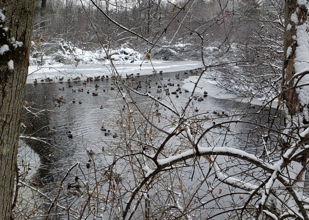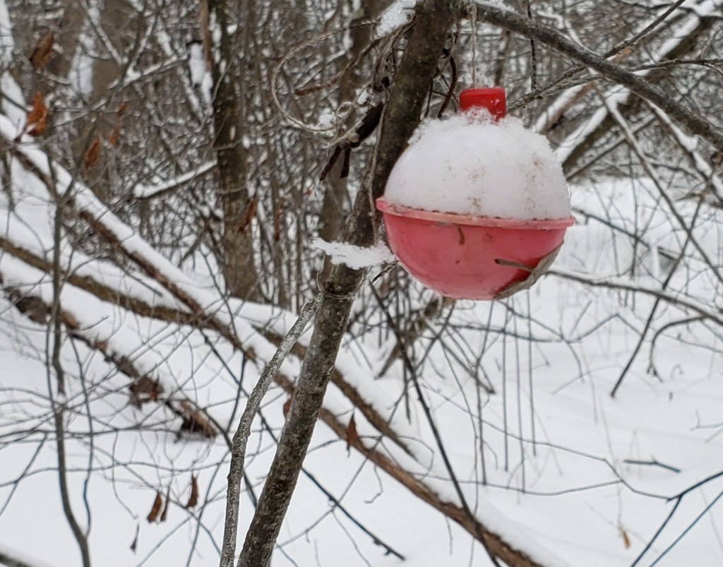 We made our way down to the Robins again — stopping and realizing that there were more than the 20 or 30 that we saw earlier and that there were probably 100 or maybe even more!!! We decided to take a little trail off to the side of the main trail and get closer to the stream and to a bridge that we saw going over the stream. We made our way down the narrow trail and found our way to the bridge. You could see lots of ducks from here. Mike even found a bobber from someone’s ill fated attempt at fishing from near the bridge. It, juxtaposed against the snow, made an interesting sight.