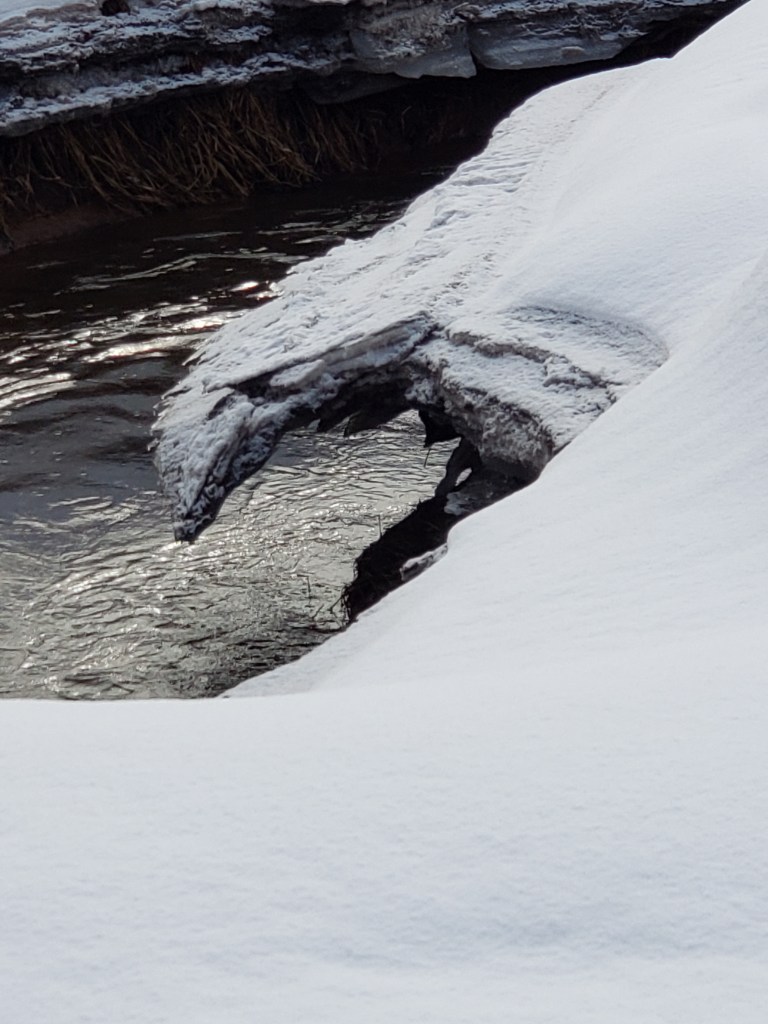 We had planned on heading across highway 37 and doing some “freestyle” snowshoeing where there were no trails but still in Guettinger Woods, but it took us a LOT longer along the trail than what we thought it would and we were kind of tired, so we decided to forego that experience and move on to our next destination: the Lower Chippewa River State Natural Area. This would be purely “off trail” bushwhacking type snowshoeing. Mike had figured out a rough plan, but it was completely up in the air as to what we would do based on the conditions. We left the parking lot and immediately were in to some pretty thick brush. Tammy found her way to the ground again (still no pictures). But we were soon to Coon Creek that Mike wanted to snowshoe along. It was absolutely breathtaking! This small creek flowing through the snow covered woods was amazingly beautiful.