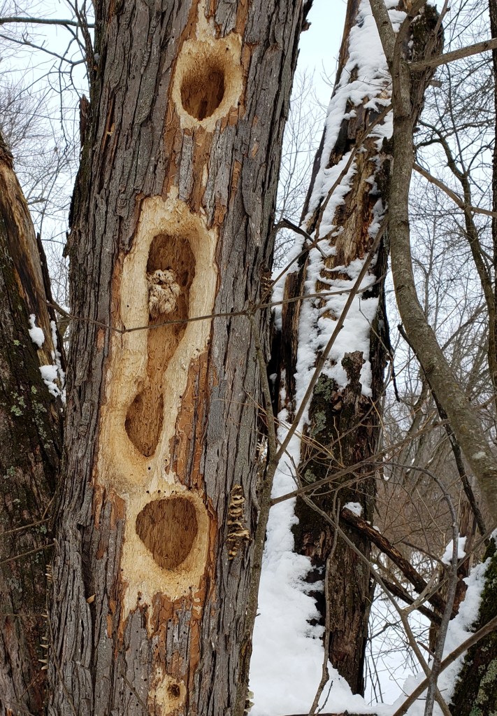 Right at the edge of the super thick brush Mike finally went down. Instead of going forward or sideways, he went backwards. He never felt more like a turtle in his life. Tammy, while trying to hold her chuckling in while Mike was swearing a blue streak, helped get him back on his feet (well, snowshoes anyway). We then made our way back through open forest to find the field where we came along the creek. We found this amazing tree that the woodpeckers were destined to take apart — it was pretty cool.