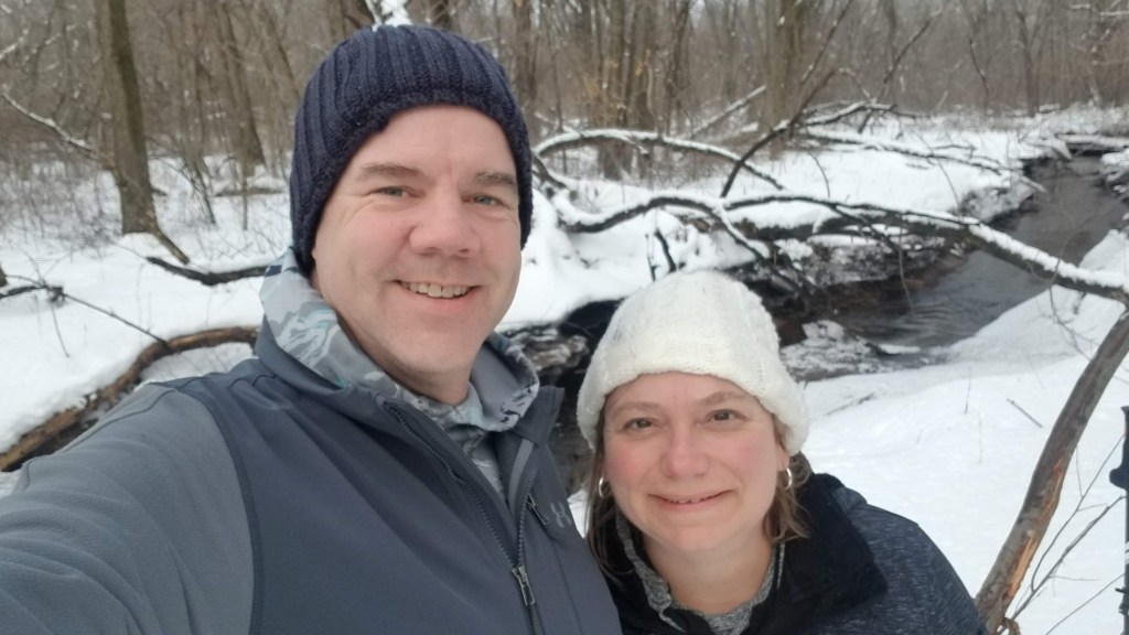 Once again, we could not bear to take weekend off from Splorin’. We thought we would just spend the day at home getting caught up on housework, sleep, and just spending time together (not outdoors). But the call of the Splor’ was too strong. It had snowed 4 or 5 inches overnight so we decided this would be the perfect opportunity for the inaugural hike on our snowshoes. Mike got them and our trekking poles ready and we decided to stay extremely close to home — Putnam Park State Natural Area is a nice 3 mile hike (out and back) the goes through some lowlands by the University of Wisconsin – Eau Claire. It is only a 2.5 mile drive from our house. We have crossed this trail MANY times on our way walking to downtown Eau Claire from home, but it wasn’t until a month or so ago that we actually walked the trail — and it was amazing. Yet another one of those things that we never knew existed until we started slowing down and spending more time on our feet in our tennis shoes instead of on our butts in a car.