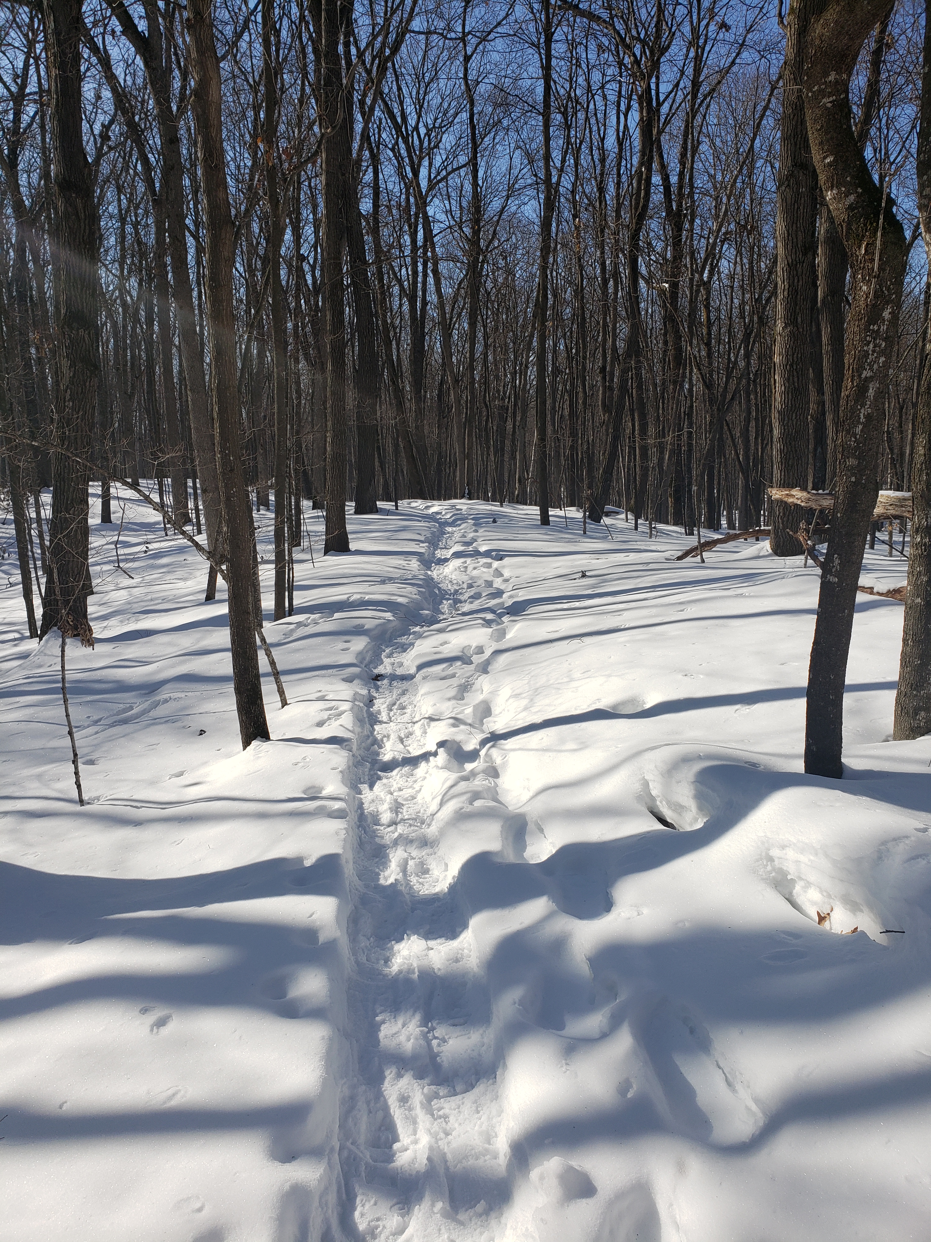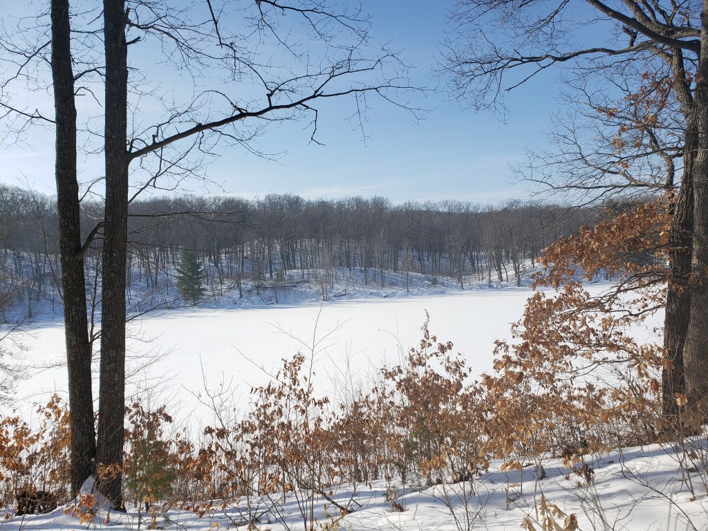 We were then on the Ice Age Trail and heading back towards Rainbow Lake. This portion of the Ice Age Trail was on top of a bluff overlooking the Straight River. It was very beautiful. We encountered many bridges along this portion of the trail — during warmer months there must be a lot of running water down the side of the hills as at this point in time the bridges just went over snow.