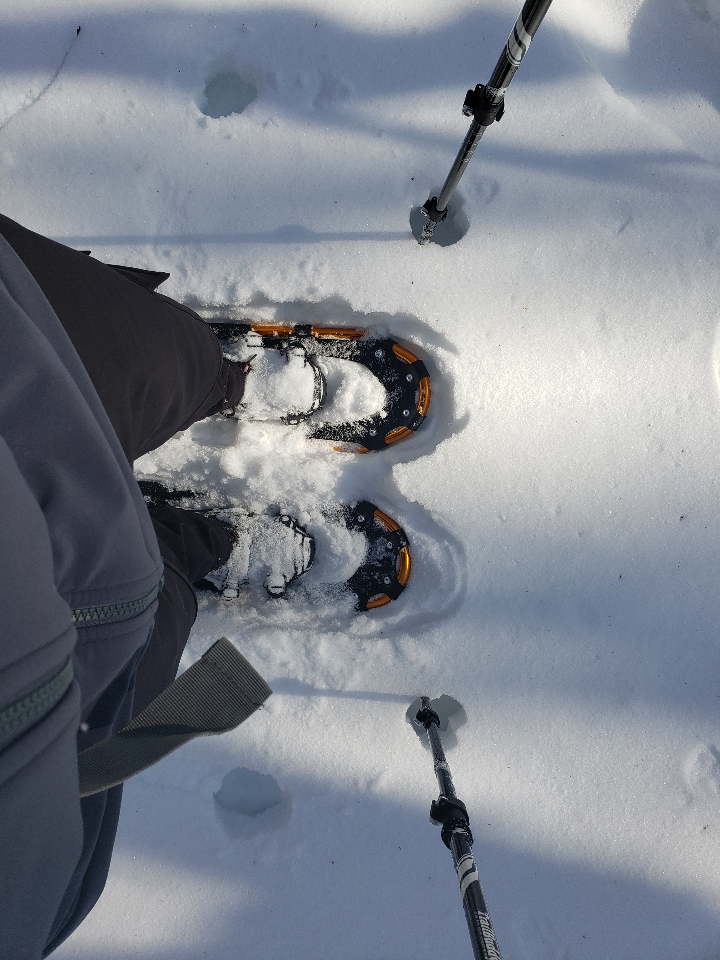 We passed two cross country skiers and one person on snowshoes. We decided that once we finished the 3 miles and made it back to the car that we would put our snowshoes on and give them a try. That way we would really be able to compare what it was like to walk along the trail and to snowshoe along the trail. Getting the snowshoes on was a little bit of an adventure seeing as how we had never worked the bindings before, but we eventually got them on and started down the trail. After about 30 feet down the trail Mike remarked “I can tell already that walking in the snowshoes is 10 times easier than just walking”. Walking just in our hiking boots was slippery — you were constantly “spinning out” in your tracks. But with the snowsoes and their crampons you just didn’t slide — you got traction and pushed yourself forward. The trekking poles with their snow baskets were a godsend since you are a little bit more top heavy with snowshoes on and every little bit of better balance was very helpful for us old folks.