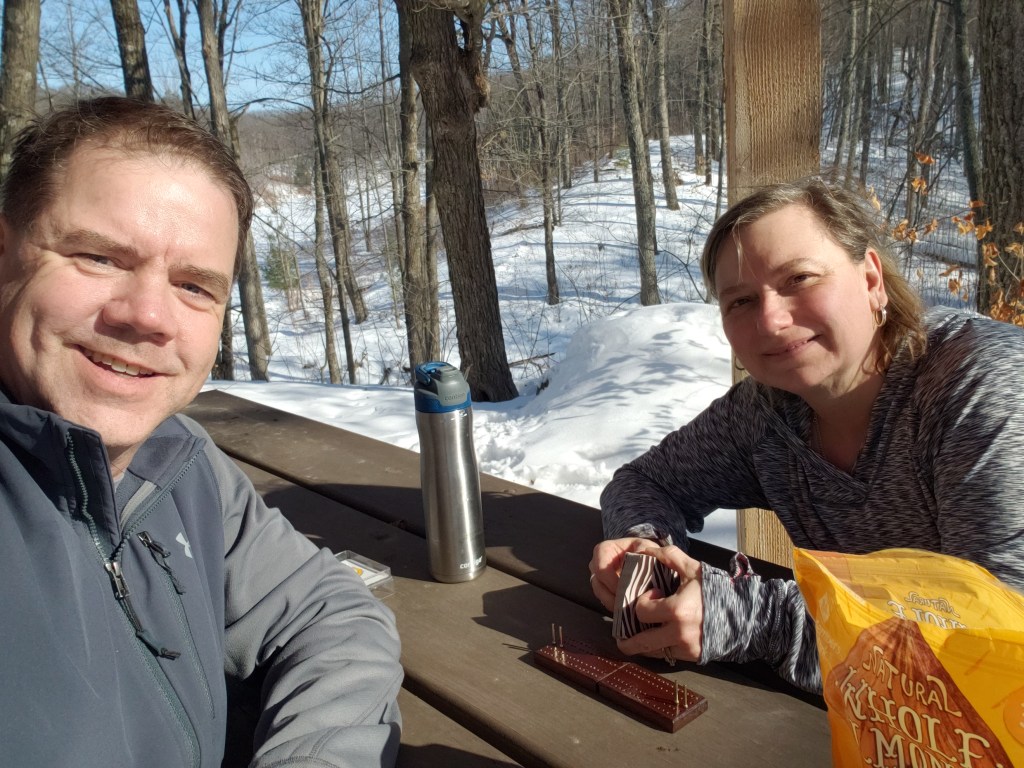 When we got back to the car — we still had some time to kill before we had to head off to dinner, so we took advantage of the warm weather and sat at a picnic table in a shelter to play a game of cribbage. Mike was killing Tammy until her last three hands when she pegged about 97 points and won going away. Oh well, it was fun anyway.