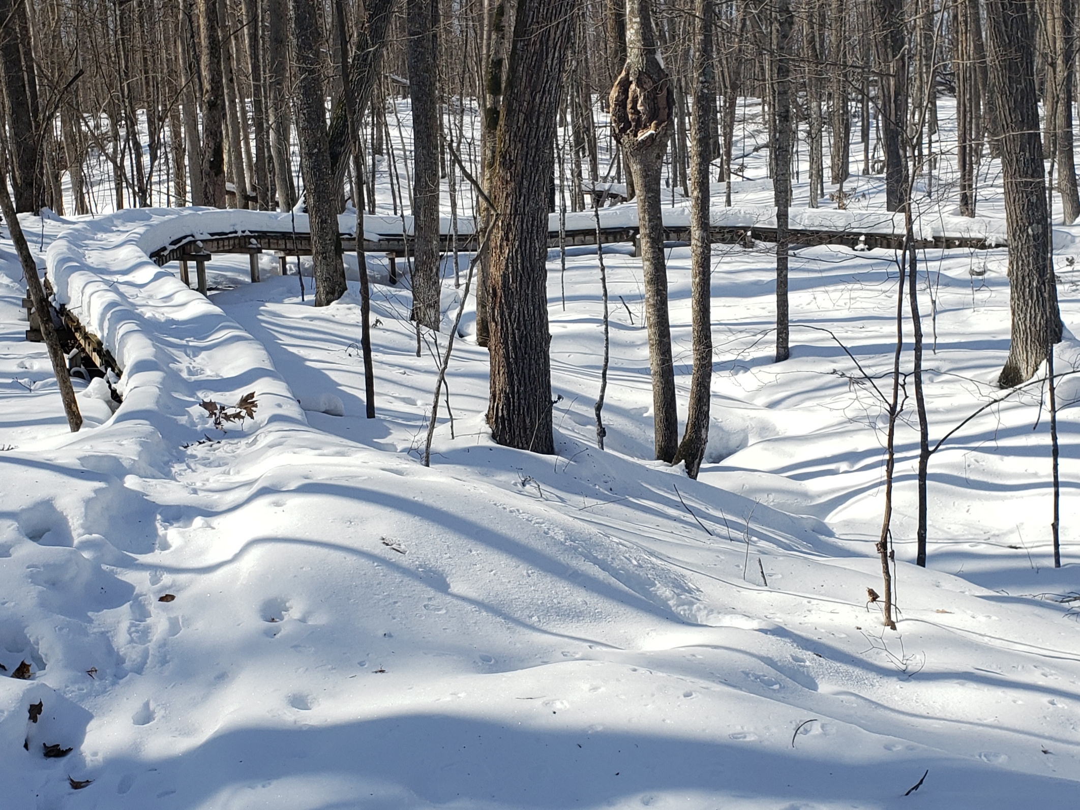 Even though it had been warmerin recent days, there was still some ice and snow around on the trails. But we dressed warmly with our Winter hiking boots on and hit the road. We hoped there would not be many people there, and we were prepared to turn around and go home if there were, to keep with social distancing guidelines, but there was only two other cars in the lot when we got there. We were good to go. We headed down the Catherine Hoffman-Hartl Memorial Wetland Trail that would take us through, surprisingly enough, some wetlands that are on the boundary of the park. It was still pretty cold so most of it was still frozen but there was some open water that was a little “marshy”.