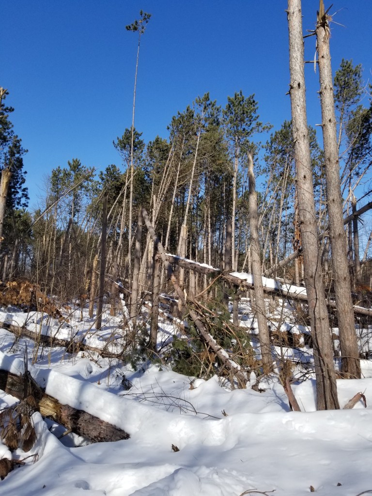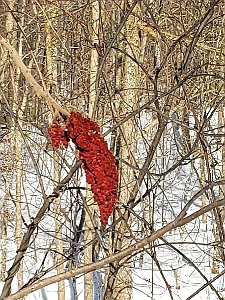 Unfortunately the trail was not as heavily trafficked as some of the other trails we had been on. So it was some pretty difficult hoofing as the snow was pretty deep in some places (and our snowshoes were resting back in the car). We finally made it to the campground parking lot and we decided to bug out — we would take the driveway out to the road and walk that road back to the main parking lot and be done. One the way out to the road we passed an area that was actively being logged. It sure looked like it was hit by some straight line winds, but thinking back it might have been done just by the loggers. Found some interesting sumac along the way too.