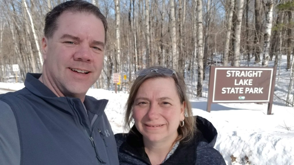 The weather was supposed to be FANTASTIC for Wisconsin in February — highs in the upper 30s/low 40s — we decided to head back to a state park we had visited back in June — Straight Lake State Park. Our loyal readers will remember that we cut our visit to this park very short as the mosquitos were unbearable at the time. We were pretty sure even with the warmer temperatures, we wouldn’t have to worry about mosquitos and it should be awesome for snowshoeing — right? Right?!?