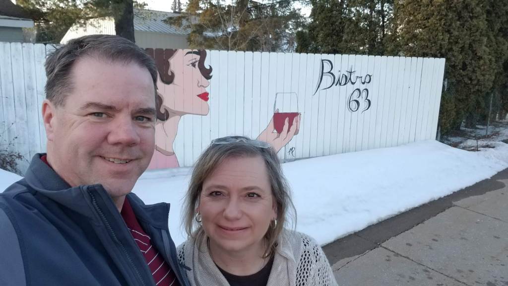 We were now off to #SupperClubSaturday. A high school friend sent us a suggestion for a place to go: Bistro 63 in Baronette, WI. Mike looks it up and sees that they open at 4PM so as long as we get there after 4PM we’re good, right? Right? Well, Tammy has noticed that while they open at 4PM they do not start serving dinner until 5PM. Ugh. So Mike is a STRONG believer in Google Maps. So he programs the restaurant in and it says we will arrive t 3:51PM. Oh oh, not open yet. So as we go along the way Google keeps saying “Hey — here’s an alternate route that takes 5 minutes longer”. So…..we take it! And another and another and another. We love traveling the back roads of Wisconsin, so take us on alternate routes!!! We finally passed by about 4:05 or so — it appeared no one was there. Just a pickup truck out front. We decided to head up the highway 5 miles or so and let Google route us back. Well, we made it back at about 4:14PM and still just that one pickup. So we kept going the other way. We turned on 27 1/2 St. Turns out this is a non-paved road (do not tell Avis please) and with the super warm temperatures and melting snow and ice — it was pretty gosh darn muddy. There were several spots where we were going sideways like we were sliding on ice — but it was on mud. Mud was flying up from the wheels. Seriously thought we might get stuck for a little while — but we made it through and decided to finally stop and go inside.