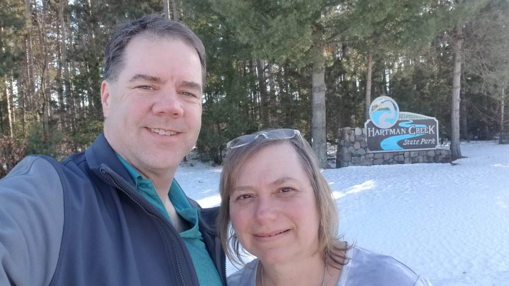 We faced a dilemma this weekend. Given what we experienced last week at Straight Lake State Park with the warm weather and the snowballing affect on our snowshoes we could not decide whether we should head south and “regular” hike, or over to Hartman Creek State Park and do some snowshoeing. The high temperature was supposed to be 34 degrees in Waupaca, WI — so we decided we might not get much more snowshoeing in this winter and decided to go for it!!