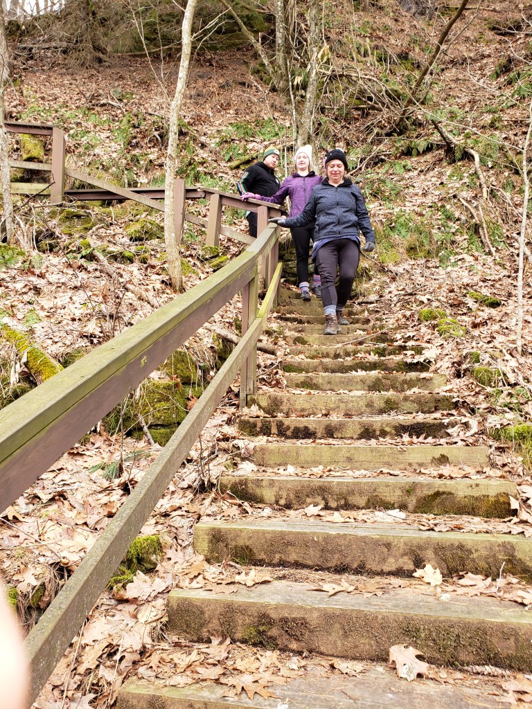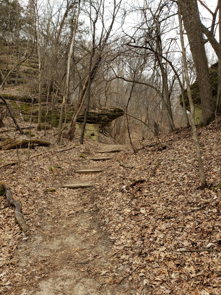We decided to take the trail that would lead us to the natural bridge first and leave the decision to go on the longer trail until later in the hike. Leaving the parking lot we immediately started up hill. We found ourselves going up some typical “CCC state park steps”: