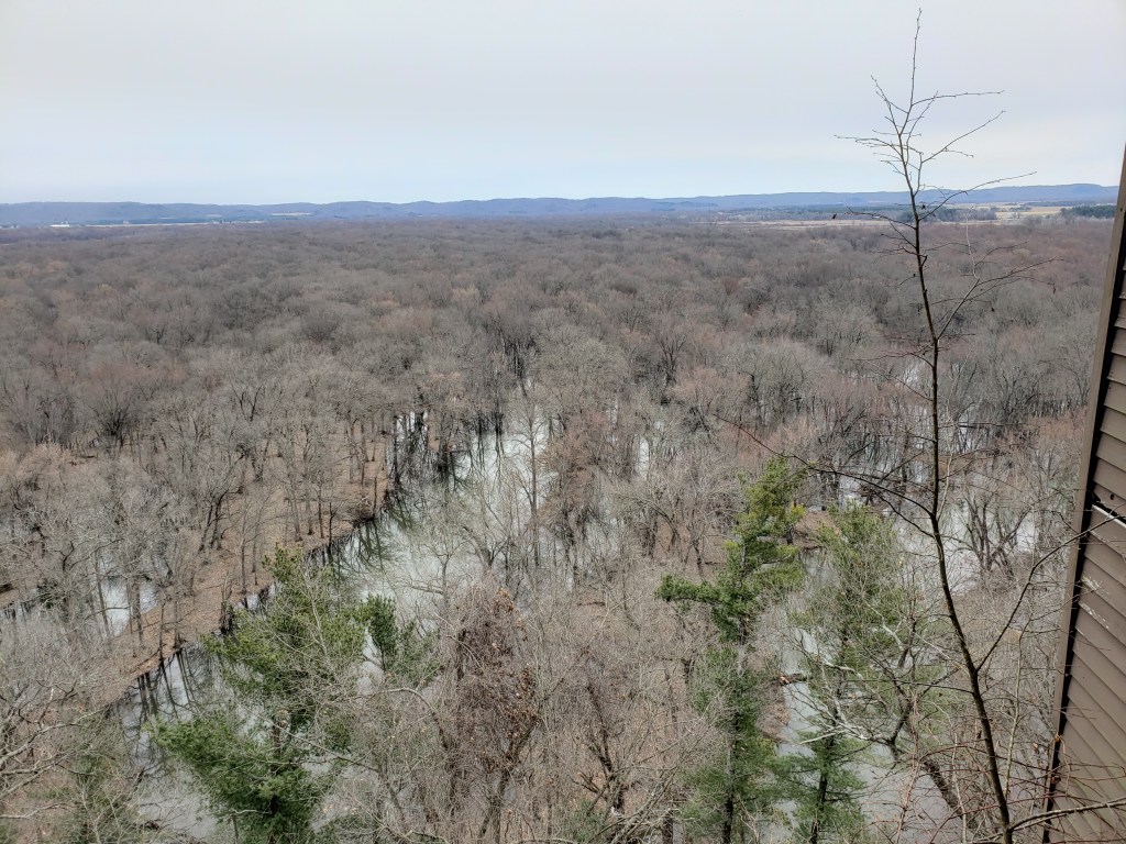 Mike put on a brave face and said he would make it to the top……but only made it two-thirds of the way up. Here was the best view he could muster from the tower. Yes, those are from woodpeckers. Hmmm, exactly how stable can the tower be if the support are being consumed by woodpeckers? Yet another good reason for Mike to stay here. 😉
