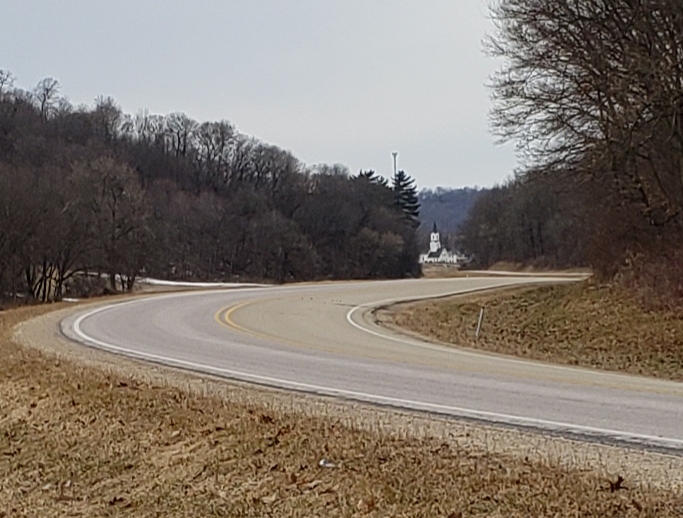 We eventually made it down to the road where the Whitetail Trail crosses a big cornfield and into the woods on the South side of the road. While on the edge of the corn field, we had quite an amazing view down the road into town where an iconic little white church stood.