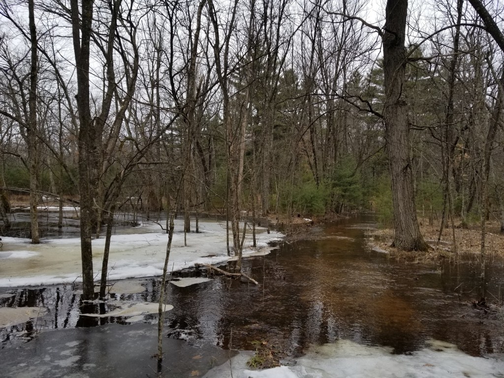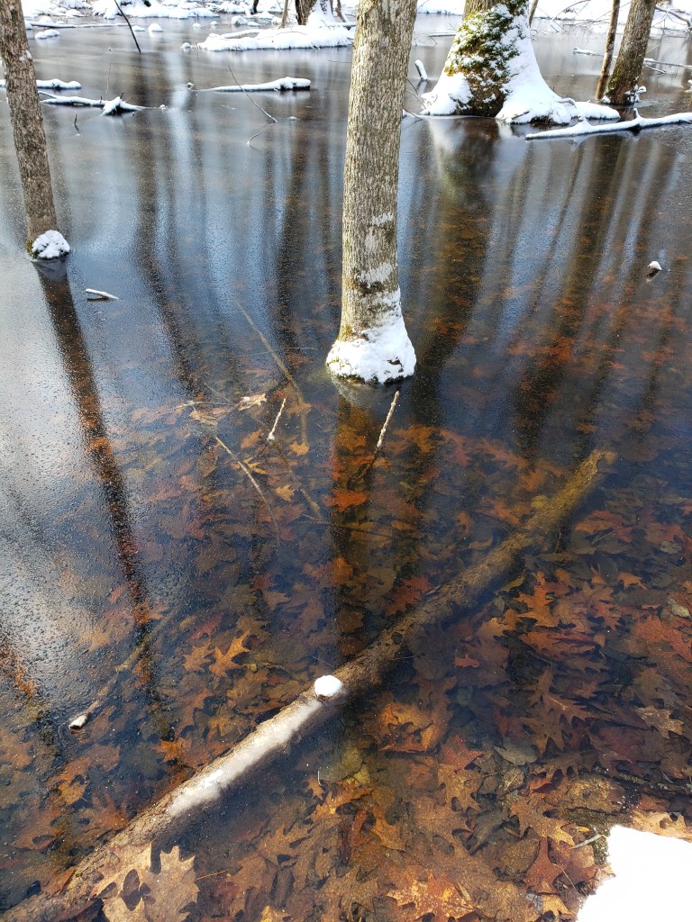 Typically when we go Splorin’ we are in one of Mike’s rental cars for work and we are used to paying the non-resident price for a daily pass. This time we were in our own van, and with all the corona virus stuff it may be a while before Mike has a rental again, so we splurged for the annual sticker for our van. (insert forshadowing music…) But since Roche-a-Cri’s main park offices are closed during the winter, we had to do self-registration to get our sticker. We completed the paperwork and stuffed it in the slot and were off down the trail for about 6 miles or so of hiking, including climbing the steps to the top of the rock formations (or so we thought — dramatic foreshadowing music playing). The plan was to do a big loop on the acorn trail and work our way back to climb the stairs to the observation decks. However as we made our way into the woods we very quickly noticed that there was a LOT of water all around the trail. We encountered a place where water was running across the trail, but just a couple of inches deep. So some quick footwork and movement on the side of the trail, while trying not to slip on the icy surface, and we were around it and barely wet. No big deal!! Unfortunately 20 yards later around a corner in the trail the water was almost a foot deep and running across the trail for as far as we could see.