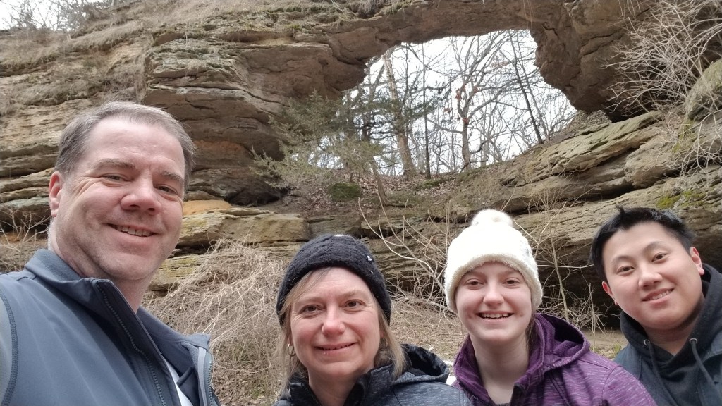 Seeing as how we were on our way to Milwaukee, our daughter and her fiance, Michael, were guest Splorers’ with us today. The plan for today (formulated at the last minute) was to take us to three parks: Roche-a-Cri State Park, Natural Bridge State Park, and Tower Hill State Park. Even though three state parks seems like a lot, these three were chosen because they were relatively small (in terms of length of hiking trails) and were in a line on our way to Milwaukee. Since they are shorter, we were spending the night after the last park in Milwaukee, and to accomodate our guests who were not excited about leaving at our “usual” 6 am or earlier time, we left a little later (7:19AM to be exact). This meant that the Y106.5 Saturday Morning Polka Party was already well underway by the time we got it tuned in on Tammy’s phone.
