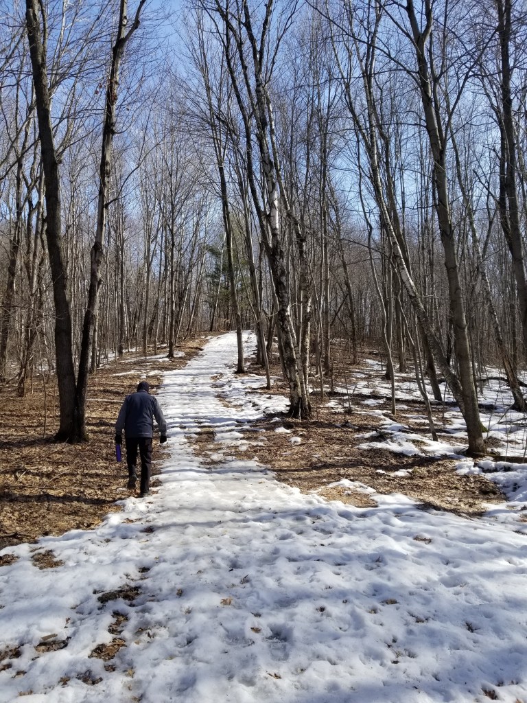 There were probably 10 – 15 vehicles in the parking lot with bike carriers on the back. Mr. Tailgating Pickup Truck Guy got out and took his big fat tire bike off his truck and headed down the trail. We ended up having to wait for another truck to leave so we could take his parking space. We found the trail we were going to head down. As we walked to the end of it we noticed the snow was starting to get soft and the ice was melting. We decided then that we were done snowshoeing for the day and would just do bareboot hiking. Given that it would possibly be still a little icy, we were not going to take any chances and still brought our trekking poles.