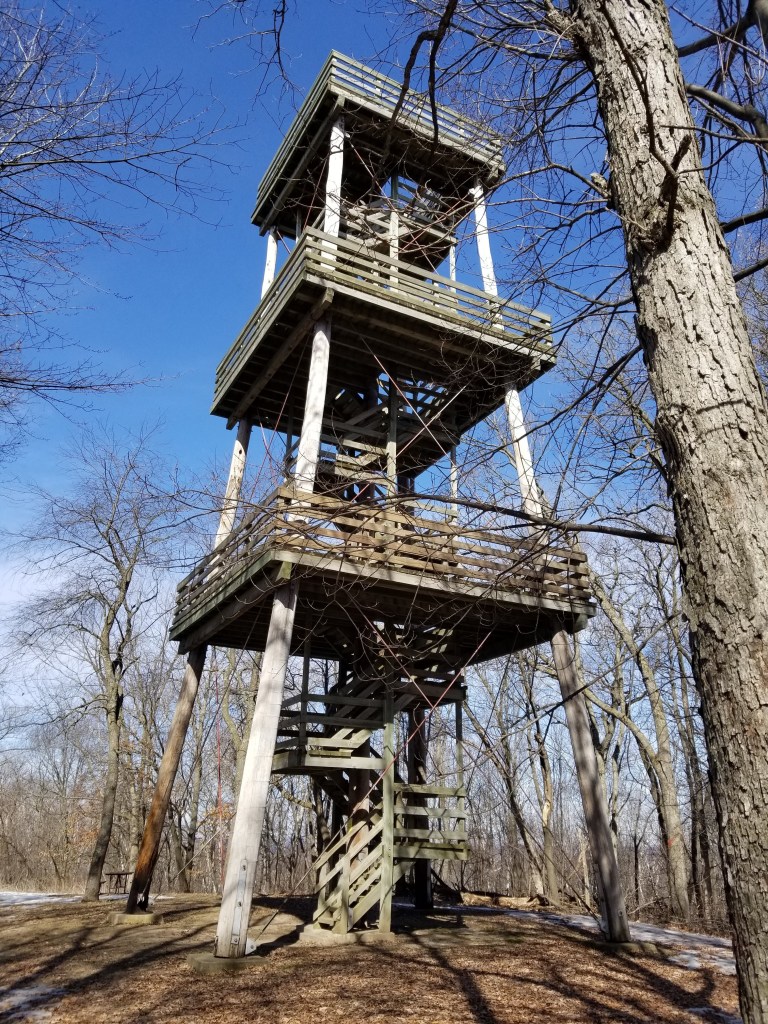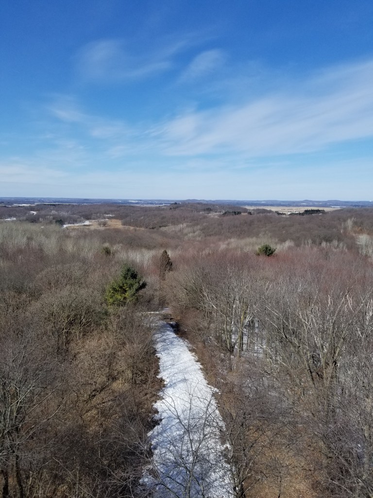 Once we were back on solid ground the trail was easy to follow. We began to make our way to the tower in the park. We knew were in for some hills, but that’s OK, we LOVE hills now (not during the climbing, but after we reach the top and have recovered — we love them). However, once we were on the North side of the hills we started seeing lots and snow and ice on the trails. The worst part about these trails is that they were groomed for cross-country skiing, so they were very packed down and had lots of ice. Our last push to the top by the tower was almost like hiking up the ice of a glacier.