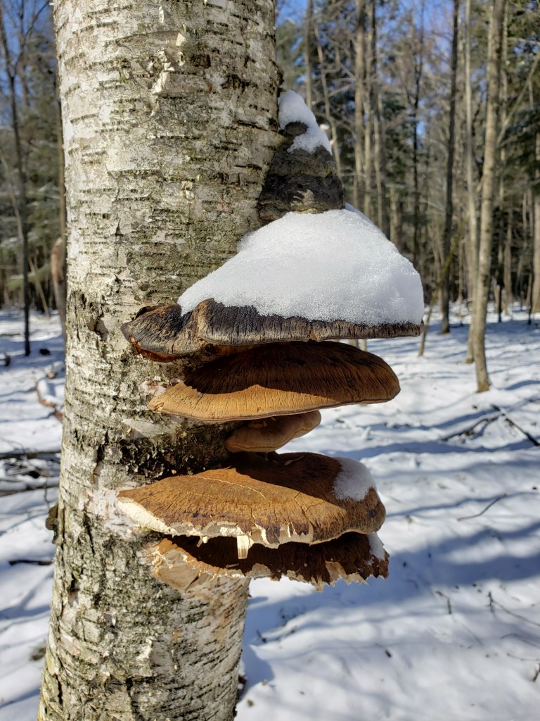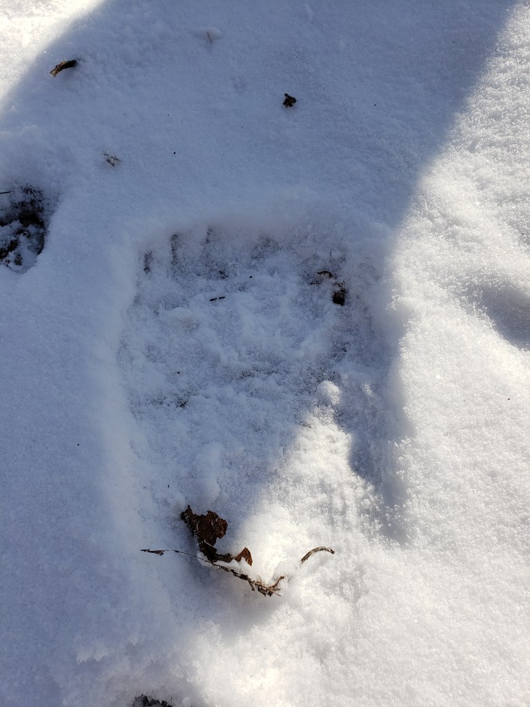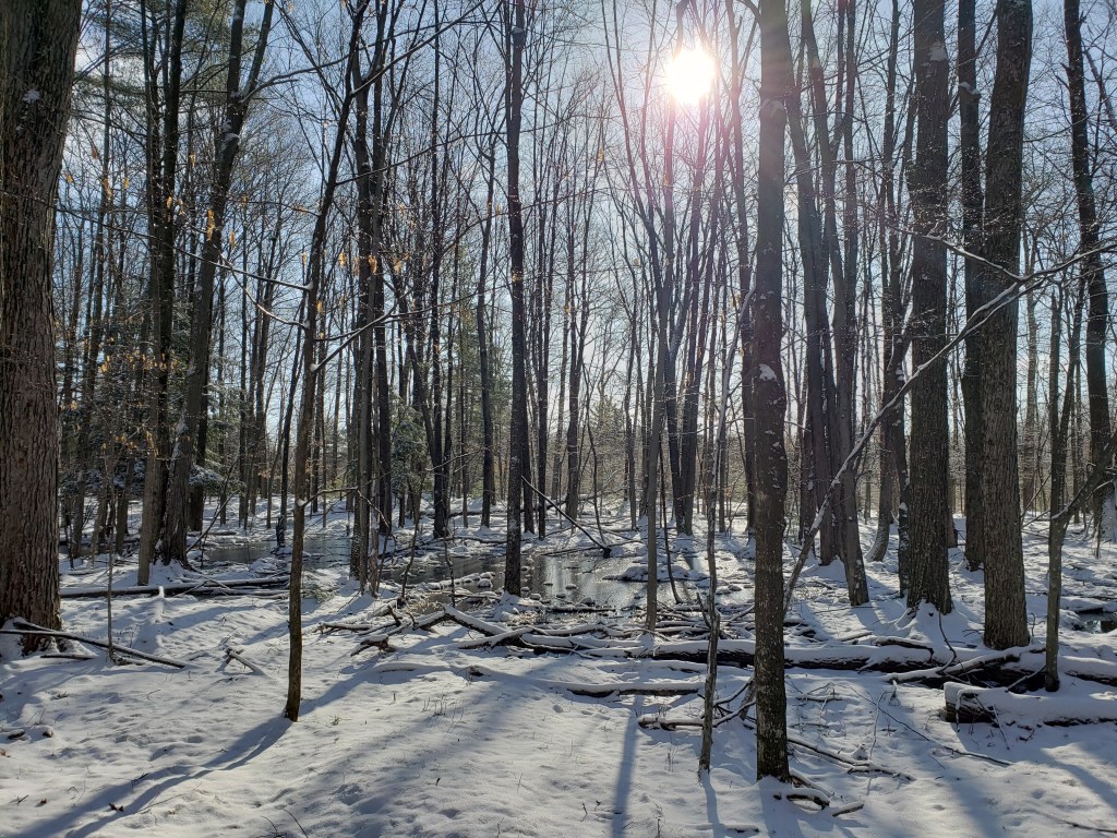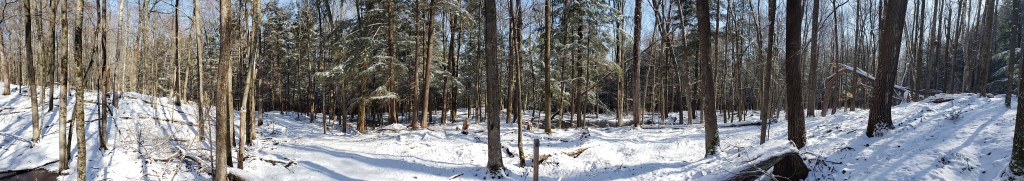 We began on the same trail that we started on in June — around Rainbow Lake. We passed the two people out ice fishing. We couldn’t tell if they were catching anything or not, but both were standing looking at their phones while their tip-ups were resting in the holes in the ice. We passed the spot where we ran into the extremely large snapping turtle last summer (he wasn’t home this time — what do turtles do in the Winter? Hmm….). Climbing a small hill we had a very pretty view back across the lake.