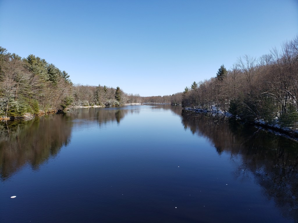 From the end of the lake we headed back to connect into the trail system. There were multiple loops and Mike had a plan that would allow us to cover all the segments of the loops with only going over two of the sections more than once. As we made our way up the first segment, we encountered more snow than ice so we didn’t feel as silly wearing our snowshoes. We were supposed to take a side trail off the main trail, but, as seems usual lately, Mike missed a turn along the trail and we ended up in the middle of the set of trails instead of traversing the outside of all the loops. Sadness…oh well, this just meant we would have to traverse more than two segments more than once. That’s OK, we determined a long time ago our hiking/snowshoeing is all about the miles!!! The more, the better!! There was a small bridge that we crossed along the dike, but it wasn’t until we viewed it from the trail above that it became picturesque.