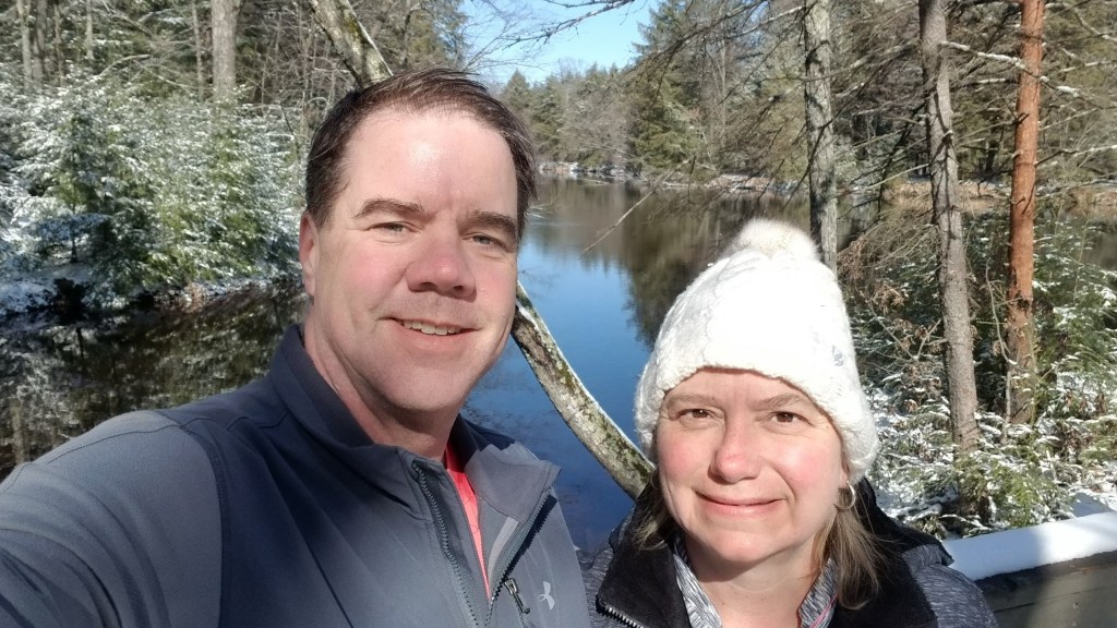 We made it back to the car after 3.15 miles of snowshoeing. Whew — that was fun and tiring. We took a break in the car eating almonds, pork rinds and Tammy texting to check on our son who dropped a butcher knife into this leg the night before (ugh). (He is fine by the way.) After a good break, it was time to head out again. We were to snowshoe from the same parking lot down towards the campground and onto Deer Path Trail around Allen Lake. As we made it down to the campground we encountered signs saying that the trail was closed due logging. DRATS!!! (Well, Mike said a lot more than that, but that will do for here. He really does not like it when we have to change the Plan). We made our way back to the car, took our snowshoes off and headed down the road to the next section of the park where we were going to snowshoe.