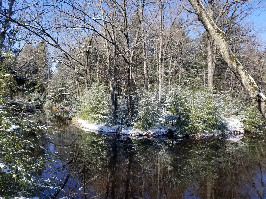 From this point Mike’s plan had our next destination being the Chippewa River. When looking at it on a map (and not on showshoes) it doesn’t look that far…but in reality it was quite a ways. We had about 3/4 of a mile to go to get to the river. Most of that was through wide open hardwood forest. Easy peasy snowshoeing. However, as we got closer to the river the underbrush became thicker and thicker. Picking our way through that brush with snowshoes and poles was difficult at best and very, very slow. However, we eventually made it to the Chippewas River. Mike kept asking Tammy if she was at the point that she just “wanted to be done”. She kept saying that she was still having fun and we could continue on.