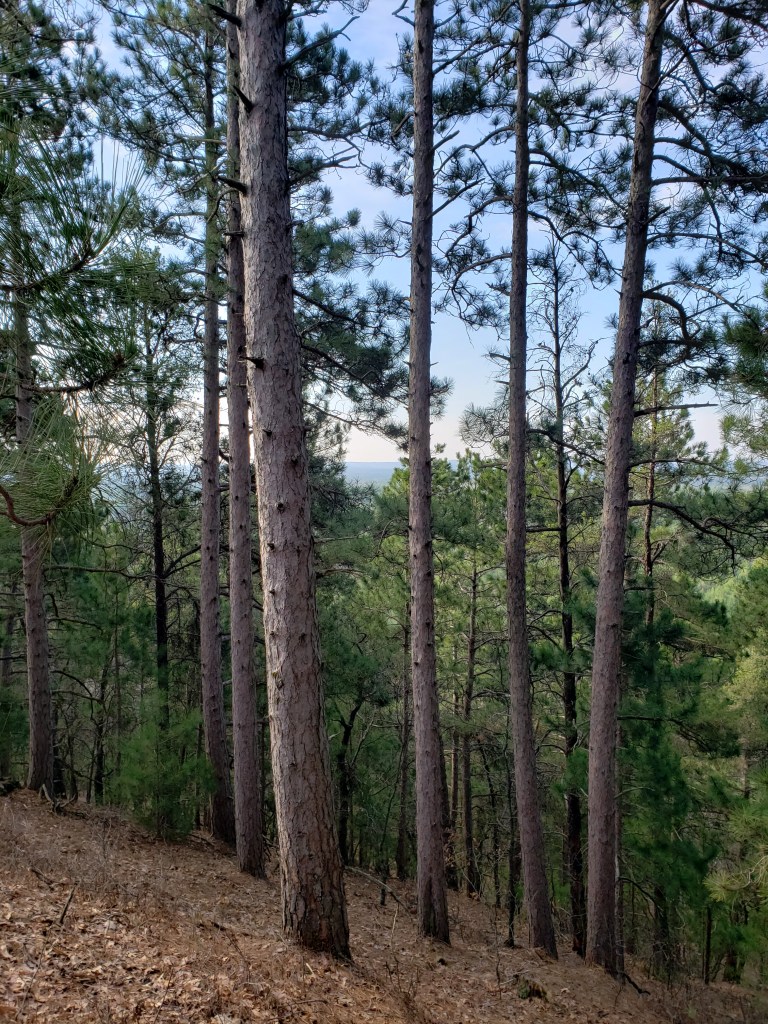 We continued along the trail to some amazingly tall pines (Red Pines?). But the strange thing was not necessarily the super tall pines but the hundreds (thousands?) of tiny pines alongside the trail. We discussed if one out of a hundred of these small trees survives to grow into the tall mature pines, or if something else dictates which ones survive. Regardless how they survive — the view is amazing!